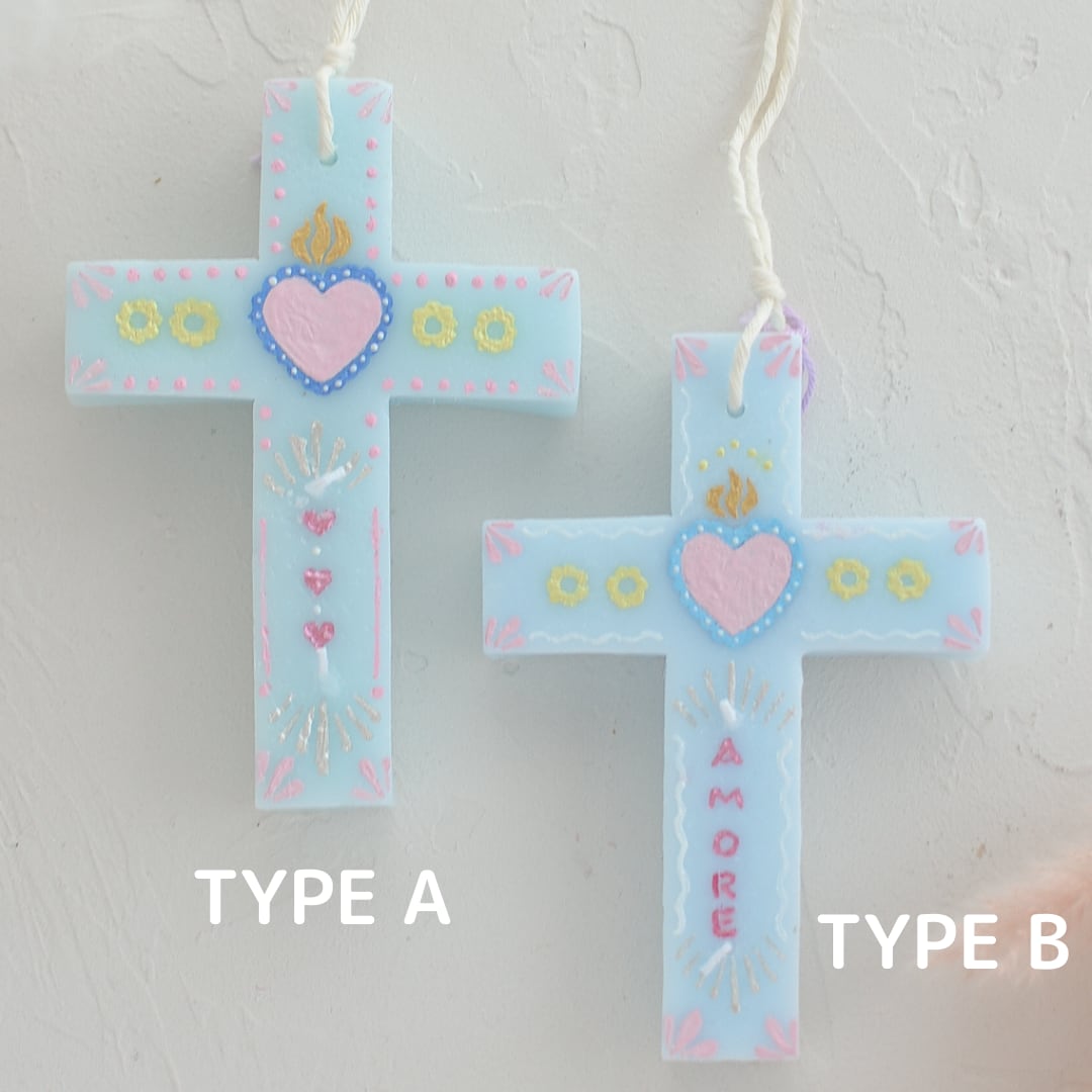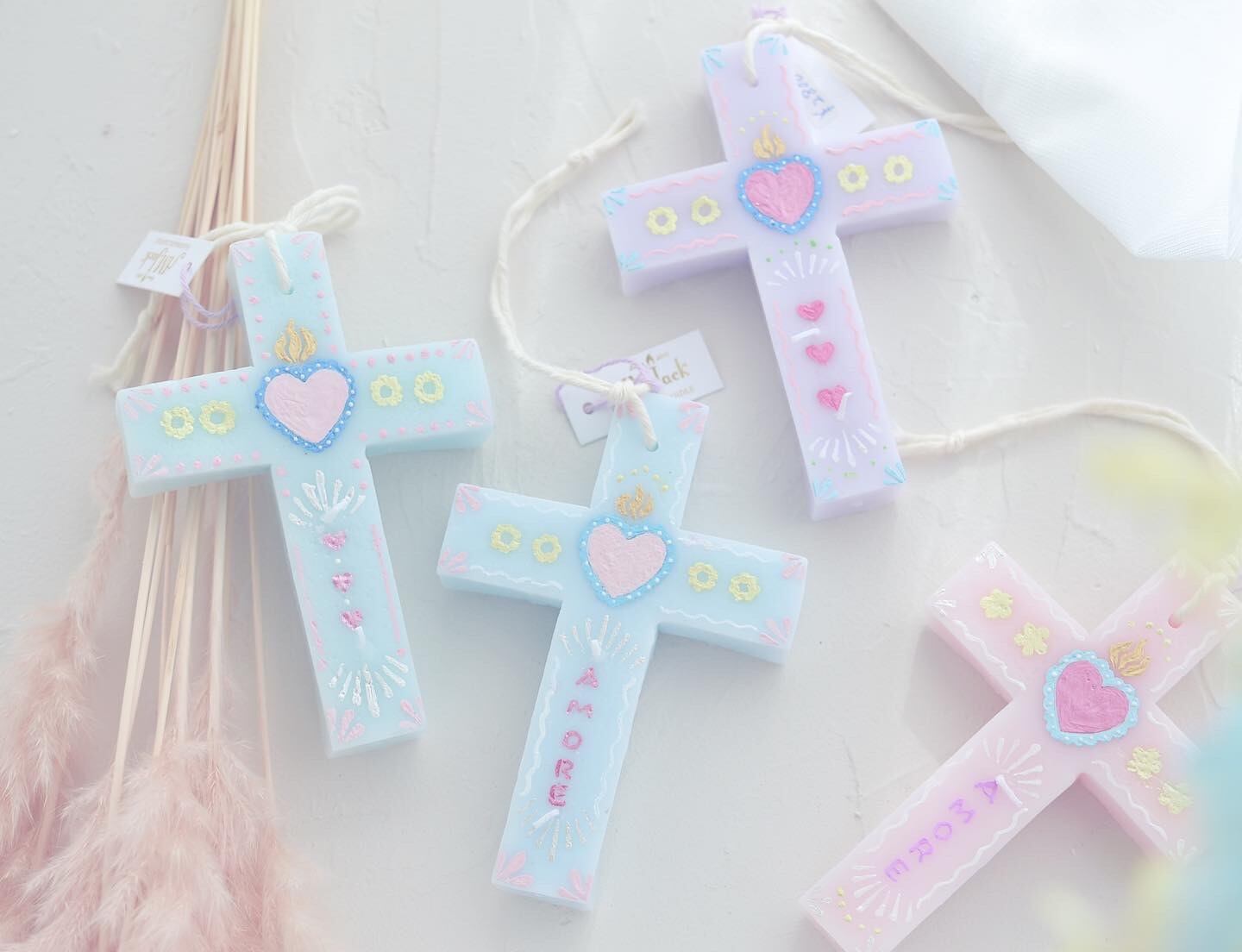 クロスには紐がついており、壁などに飾って楽しんだり、そのまま棚やお皿に飾るのもよし。