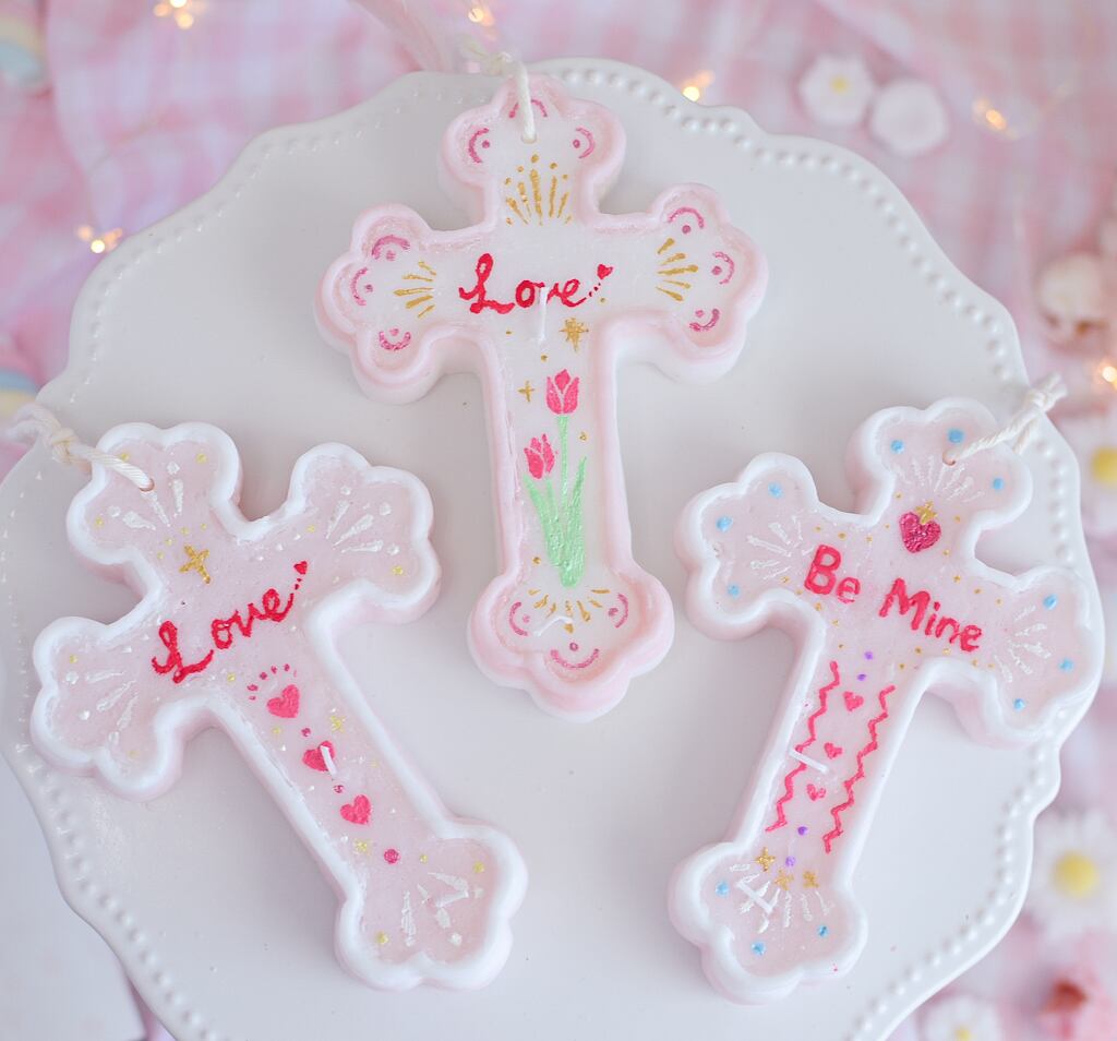 人気のメッセージか描かれたクロスキャンドル。