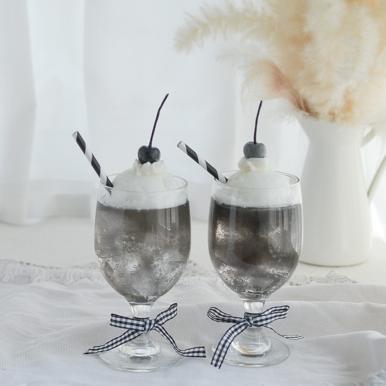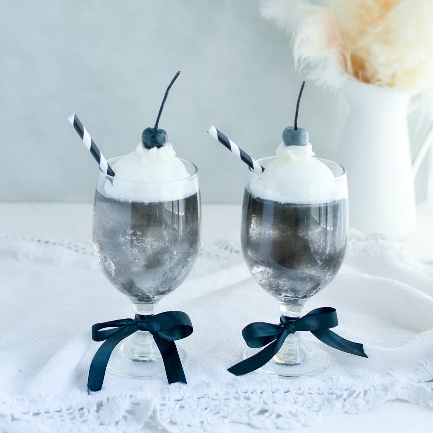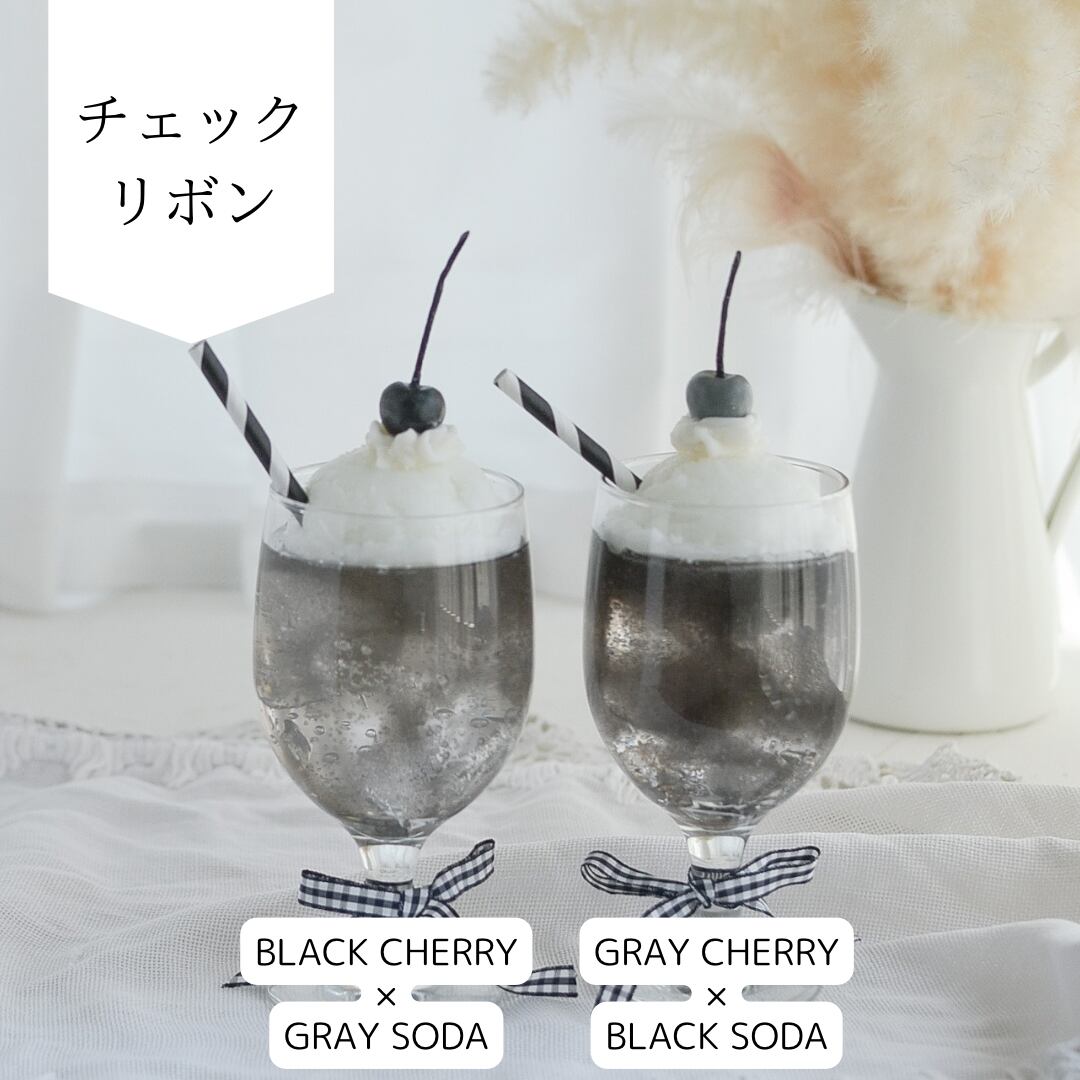 BLACK シリーズはリボンの色とソーダの色が選べます。グレーと書いてある方が透明感のある黒(グレー)ソーダとなります。